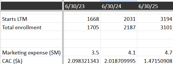 At a for-profit college facing strain, CAC’s rise. However here CAC’s are declining, which is a good sign.
