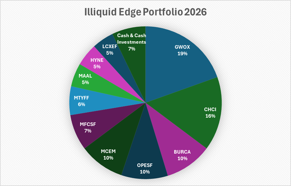 Each of these owned businesses is illiquid, and trade at what I estimate to be under half of their intrinsic value. As I discuss in my investing philosophy statement, each of these businesses is creating shareholder value independent of market pricing. All are backed by significant assets and cash, and should do well in a downturn. I feel very comfortable owning this group of businesses heading into 2026.